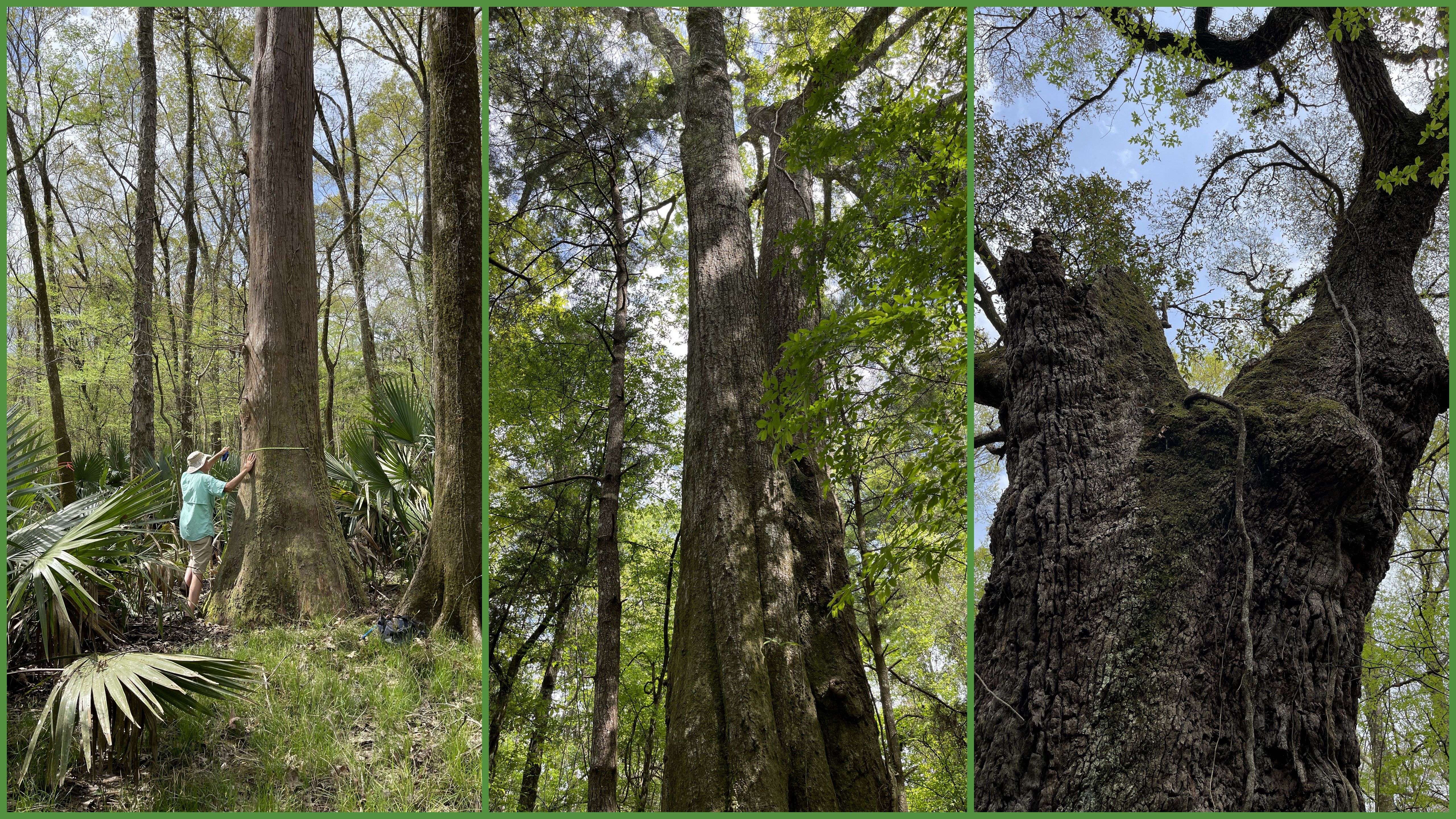 Features The trail designated on the map as the Otter Loop to the east leads you from the trailhead to the southeast first to a legacy cypress tree. This tree was dated by the Louisiana Purchase Cypress Legacy organization and is estimated to be between 400 and 600 years old. There are several other majestic cypress in the swamp areas of the sanctuary. If you continue on the trai and turn right on Red Fox Traill, you will find the lone Live Oak on the property. This ancient tree is standing on a bit of raised land, which is undoubtedly the reason it has survived in the swampy environment. At approximately 23 feet in circumference, calculations estimate the tree to be at least 350 years old. Both of these trees are marked with commemorative brass plaques with their names in the Chitimacha langage. Please visit this page to read the story of The Naming of the Trees.